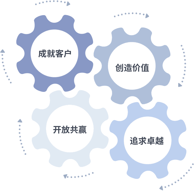 成就客户是一切决策的出发点,,创造价值是衡量所有工作的标准,,追求卓越是我们做事做人的态度,,,开放共赢是我们的格局也是最终的结果。。价值观的齿轮环环相扣,,,推动着组织里的每个人不断向前。。